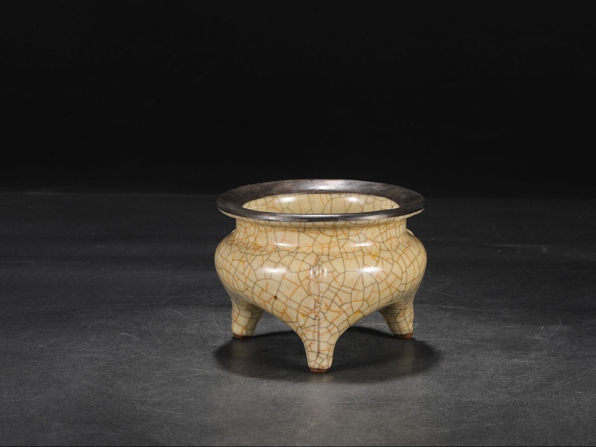 - 「宋 哥窯 陶磁器 米黄釉 銀口宮廷御用 大香爐」染付 置物 擺件 古賞物 中国古美術 旧蔵出