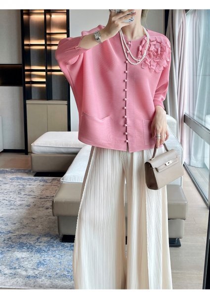 - 2508プリーツpleats 長袖上着シャツ前開き肌触り弾力ドレープ性いい手芸花柄飾リピンク色