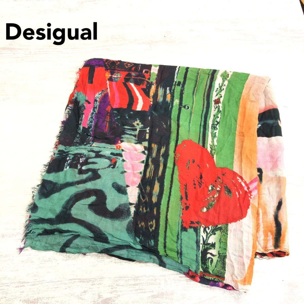 > 2H2523-J◆Desigual デシグアル 大判ストール◆総柄 薄手 プリント 顔 ハート バラ インテリア 飾り ひざ掛け リメイク カラー