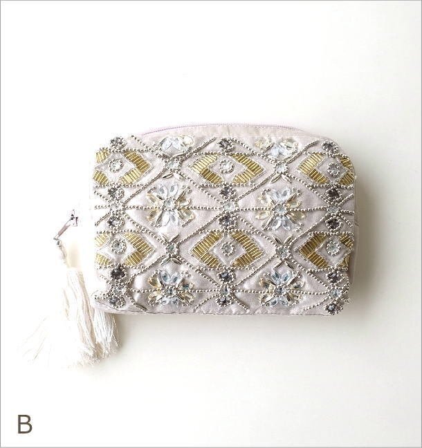 - ポーチ 小物入れ マチあり かわいい デザイン タッセル 布張り おしゃれ ビーズ刺繍ポーチM 【Bカラー】 送料無料(一部地域除く) kan2855b