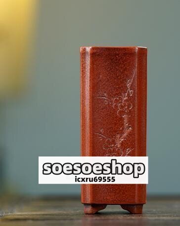 - 紫砂 紫泥 盆栽鉢 植木鉢 角鉢 山水風景 浮き彫り 紫泥絵 四角 手作り ハンドメイド高さ13*口径5.1cm