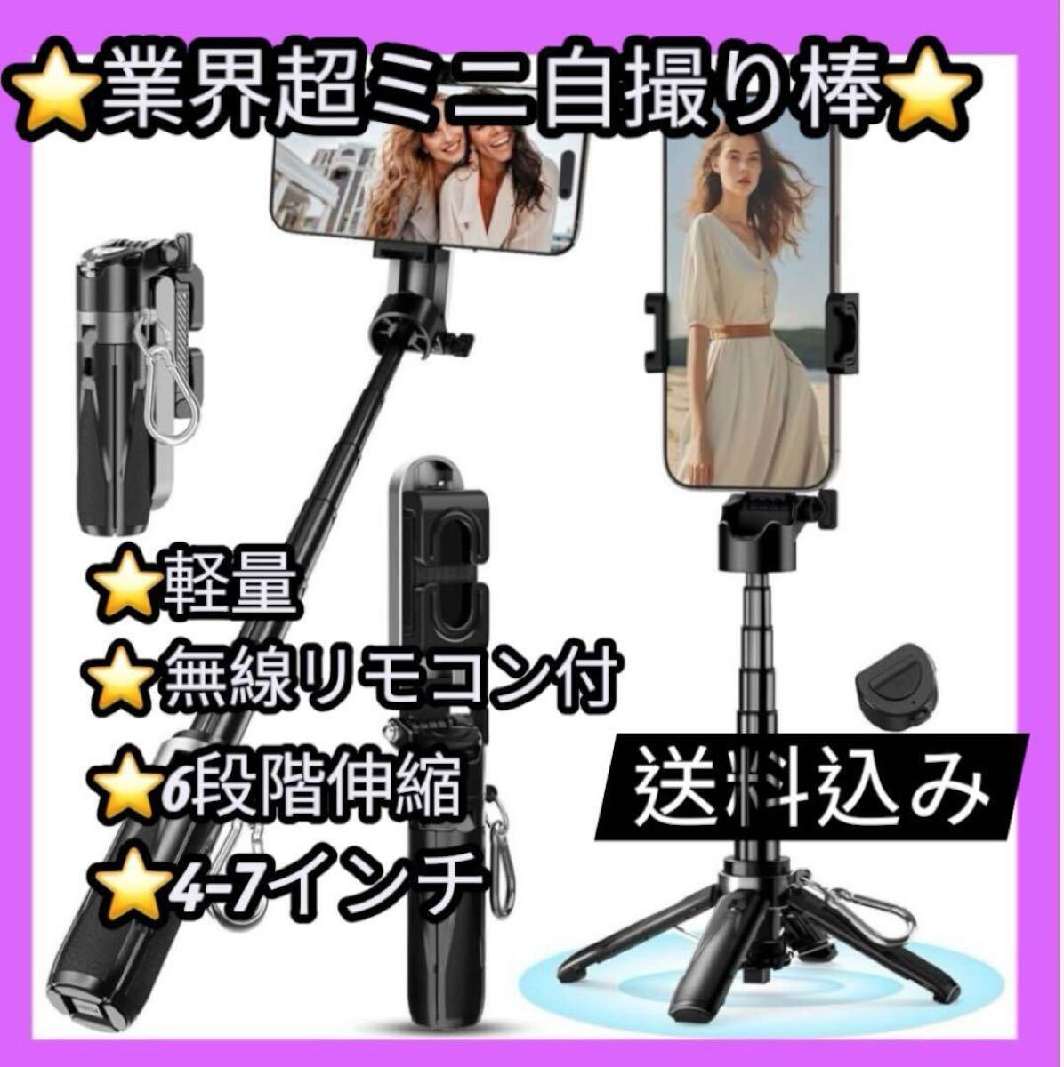 - 新品自撮り棒業界超ミニ軽量360度回転 無線リモコン付6段階伸縮 4-7インチ
