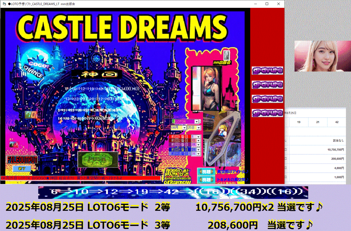 真夏の新作[◆LOTO予想ソフト_CASTLE_DREAMS_LT] ロト予想ソフト2025年08月25日 LOTO6モード 2等 10,756,700円x2 当選です♪
