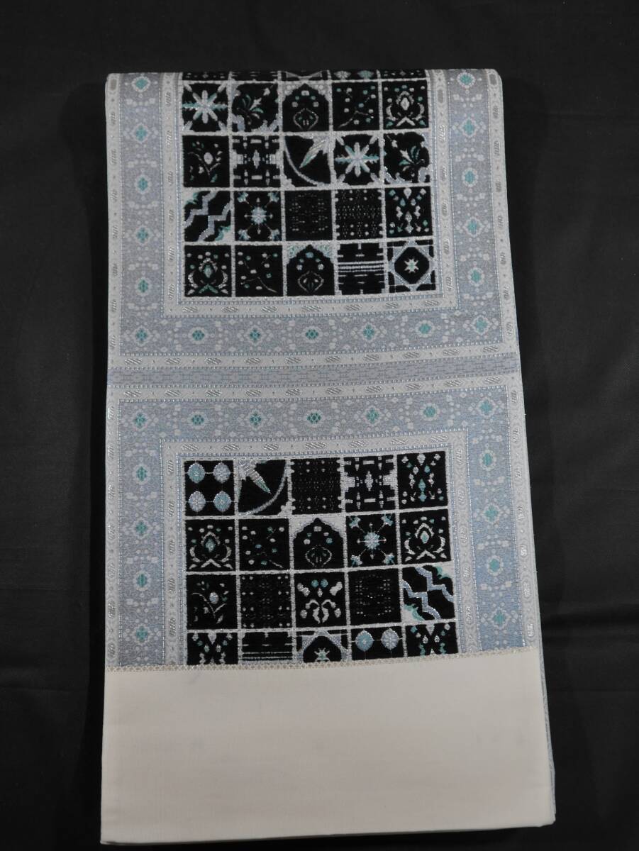 > 未仕立て新品 西陣織最高級袋帯 大竹しのぶさん着用柄 格子幾何学文 白地 六通総柄 正絹 お仕立て代込み 送料無料