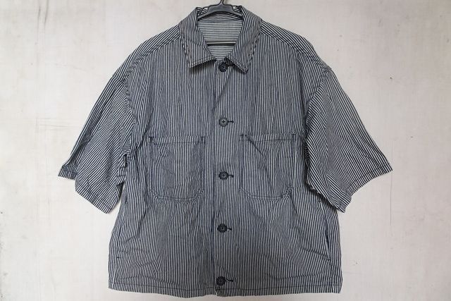 - GU/ジーユー/331-334226/シェフシャツ/半袖ジャケット/ヒッコリーストライプ柄/オーバーサイズ/インディゴブルー/白/Mサイズ(8/26R7)