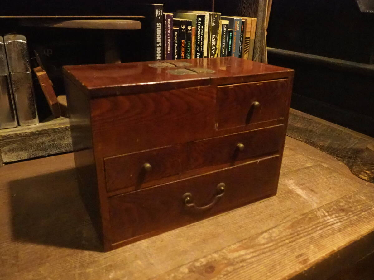 - 【昭和レトロ裁縫箱】引出し収納掛け硯古道具飾り金具アンティーク硯箱インテリア木製文具インダストリアル事務書棚ウッドケース箪笥レジ台