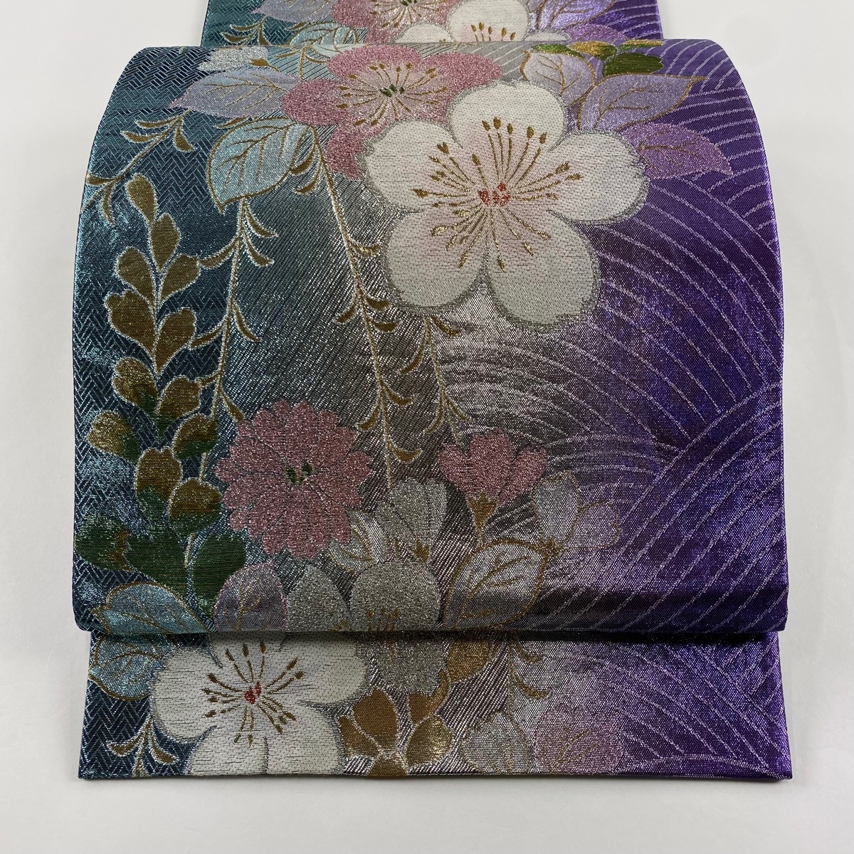 > 袋帯 秀品 桜 草花 ラメ糸 箔 薄緑 六通 正絹 【中古】