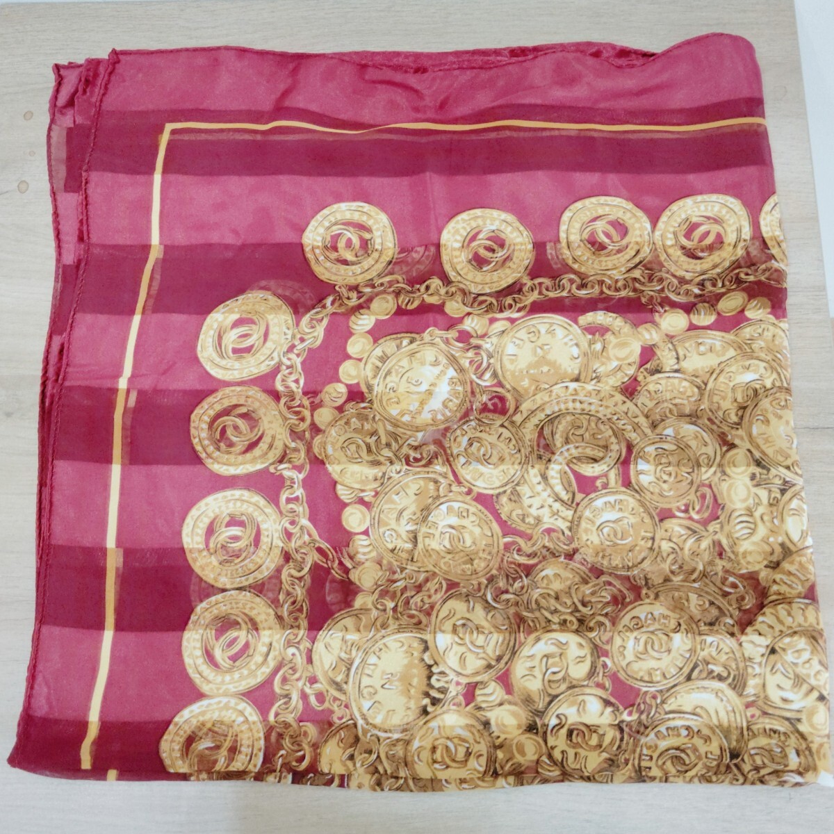 - スカーフ 大判 ワインレッド色 コイン柄 チェーン柄 レディース