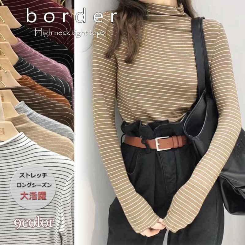 - ボーダーカットソー レディース 長袖 トップス ハイネック タイト フリー ブラック