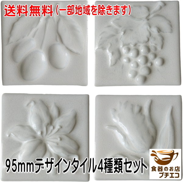 - 送料無料 95mm 角 デザイン タイル レリーフ 4種類 セット日本製 DIY タイルクラフト 陶器 国産 美濃焼 陶板 花柄