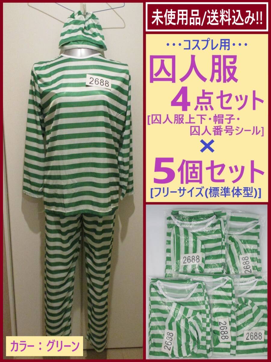 - まとめ売り 未使用 コスプレ [ 囚人服 4点セット ] ×5セット 緑 A フリーサイズ 男 女 兼用 ハロウィン 仮装 イベント 祭 長袖 グリーン