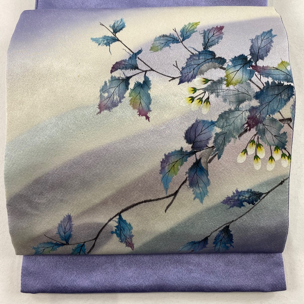 - 袋帯 秀品 落款 やまと 枝花 銀通し ぼかし 青紫 お太鼓柄 正絹 【中古】