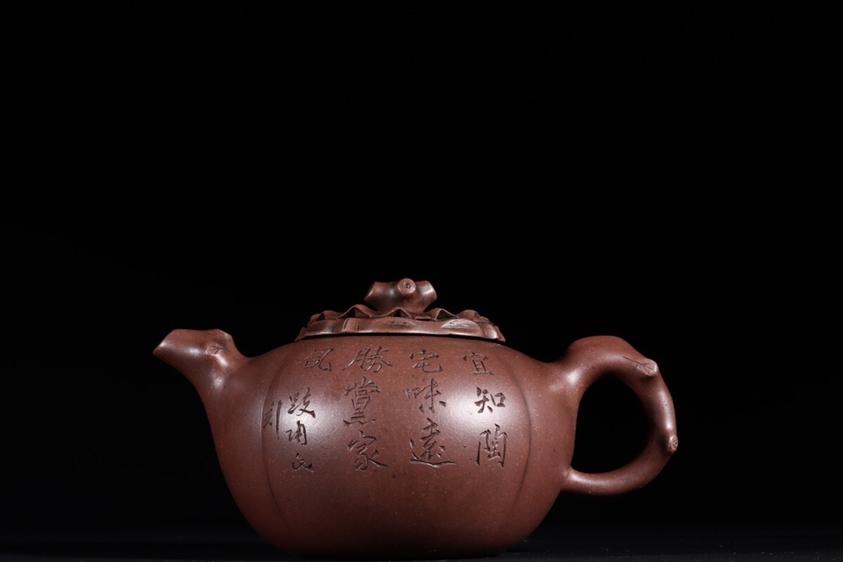 - 「紫砂彫 詩文刻絵翻蓋柿圓紫砂茶壺 巻翁 馮桂林銘 民國時期」陶磁器 急須 茶道具 古賞物 中国古美術 旧蔵出