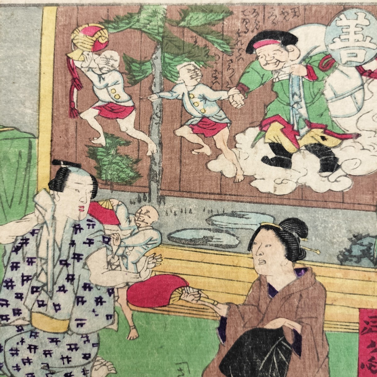 - 面白い戯画!明治期/真作 昇斎一景「教訓善悪鏡 善 九」本物浮世絵木版画 諷刺画 錦絵 中判 裏打ち