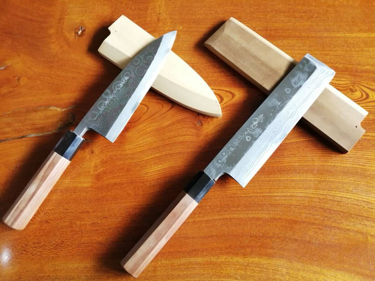 - 菊一文字 出刃包丁(190) 鱧切(220) 青紙 青鋼 鏡面 墨流し ダマスカス模様 白鞘付き 和包丁 未使用