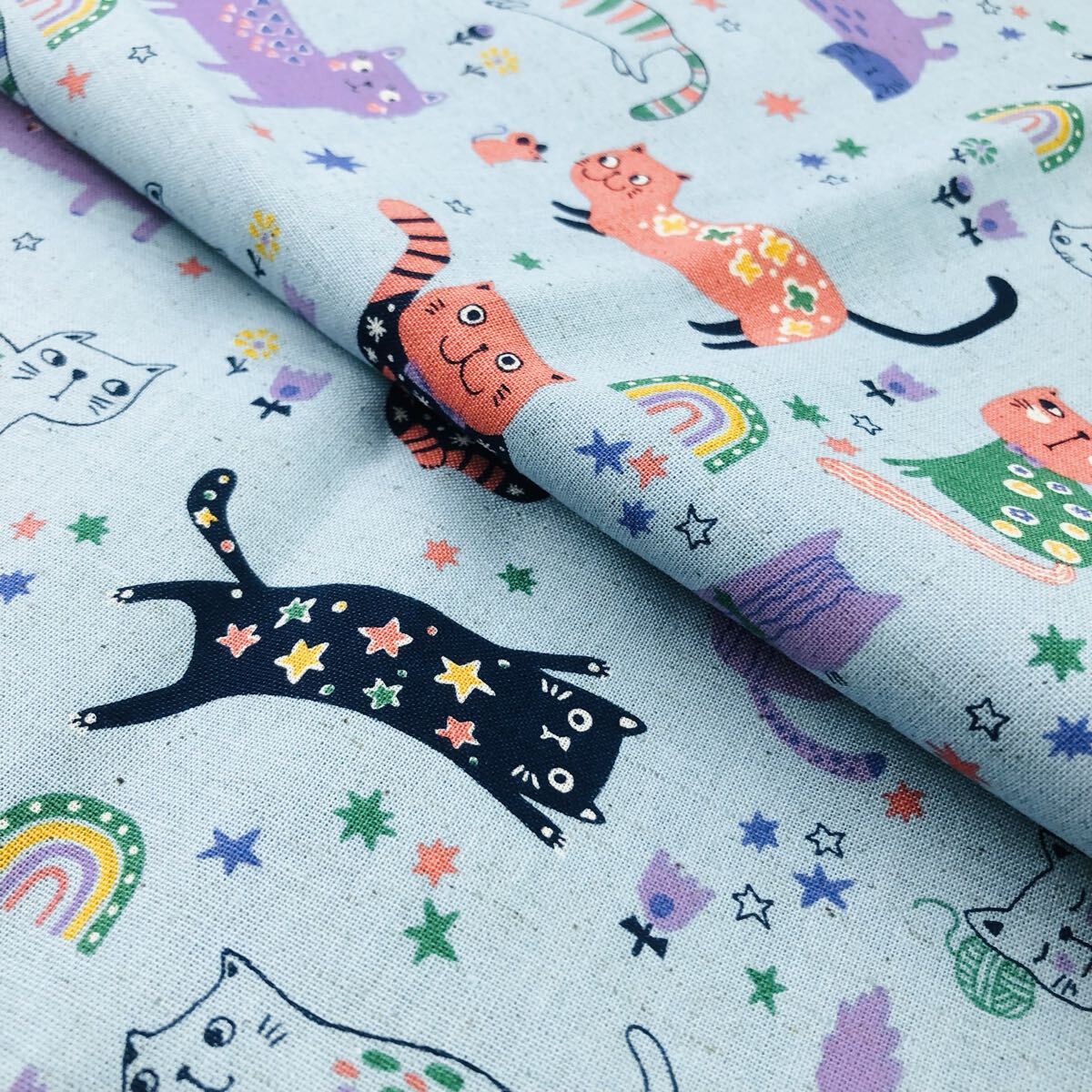 - 110×50 ネコ柄 綿麻シーチング 生地 はぎれ 猫 くすみブルー