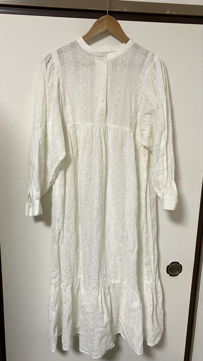 - シャツワンピース 花柄 総刺繍 ロング丈 白 ホワイト ノーカラー
