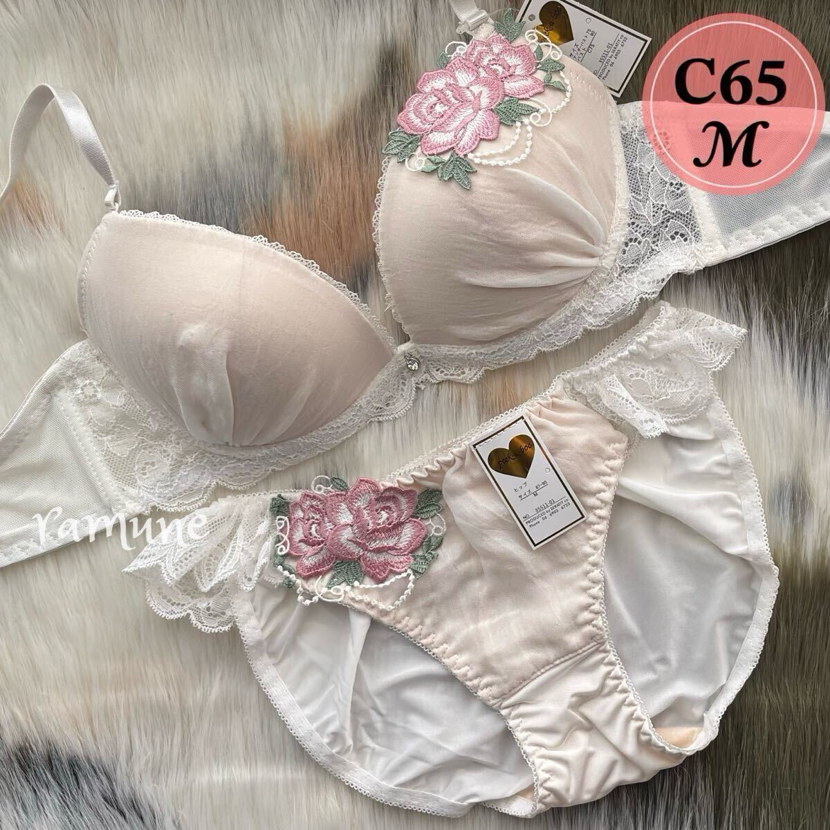 - 【C65/M オフホワイト】新品 ブラジャーショーツ パッド付き バラ刺しゅう 薔薇 レース かわいいパンティ 谷間メイク 盛りブラ Cカップ
