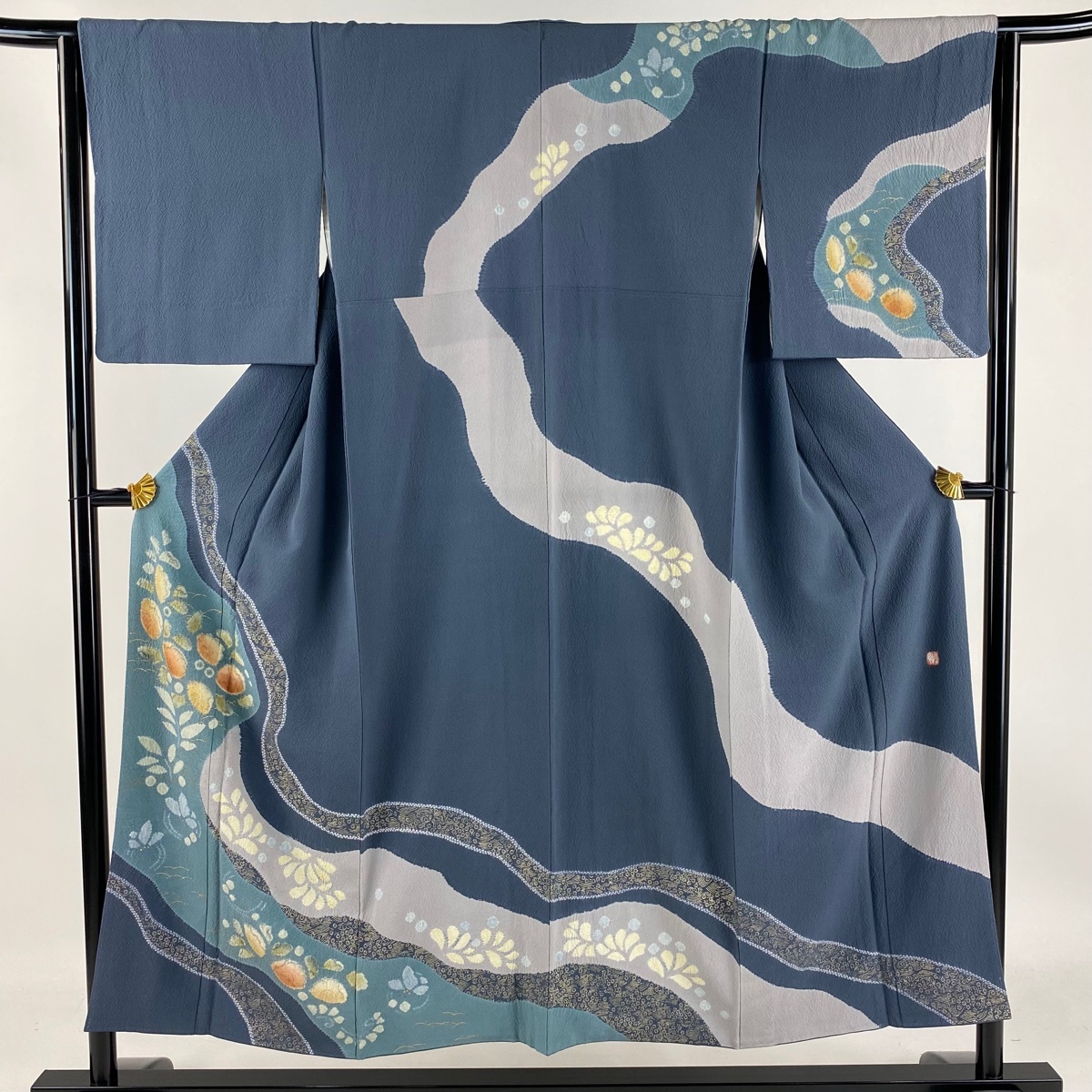 - 訪問着 身丈151cm 裄丈64cm M 袷 滝泰 落款 辻が花 霞 金彩 青灰色 正絹 名品 【中古】
