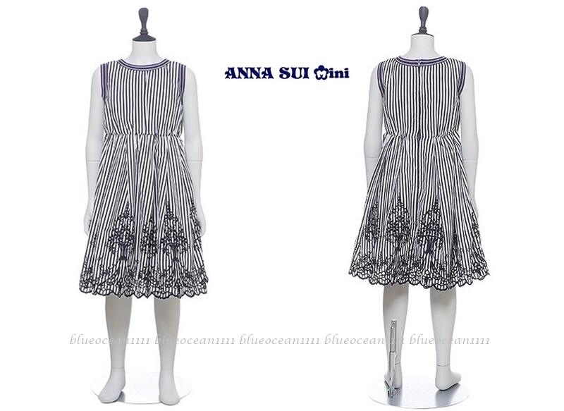 > 新品 18,480円 【アナスイミニ】裾スカラップ フラワー刺繍 ネイビーストライプワンピース 150cm お出かけ スカート ブラウス カーデ 140