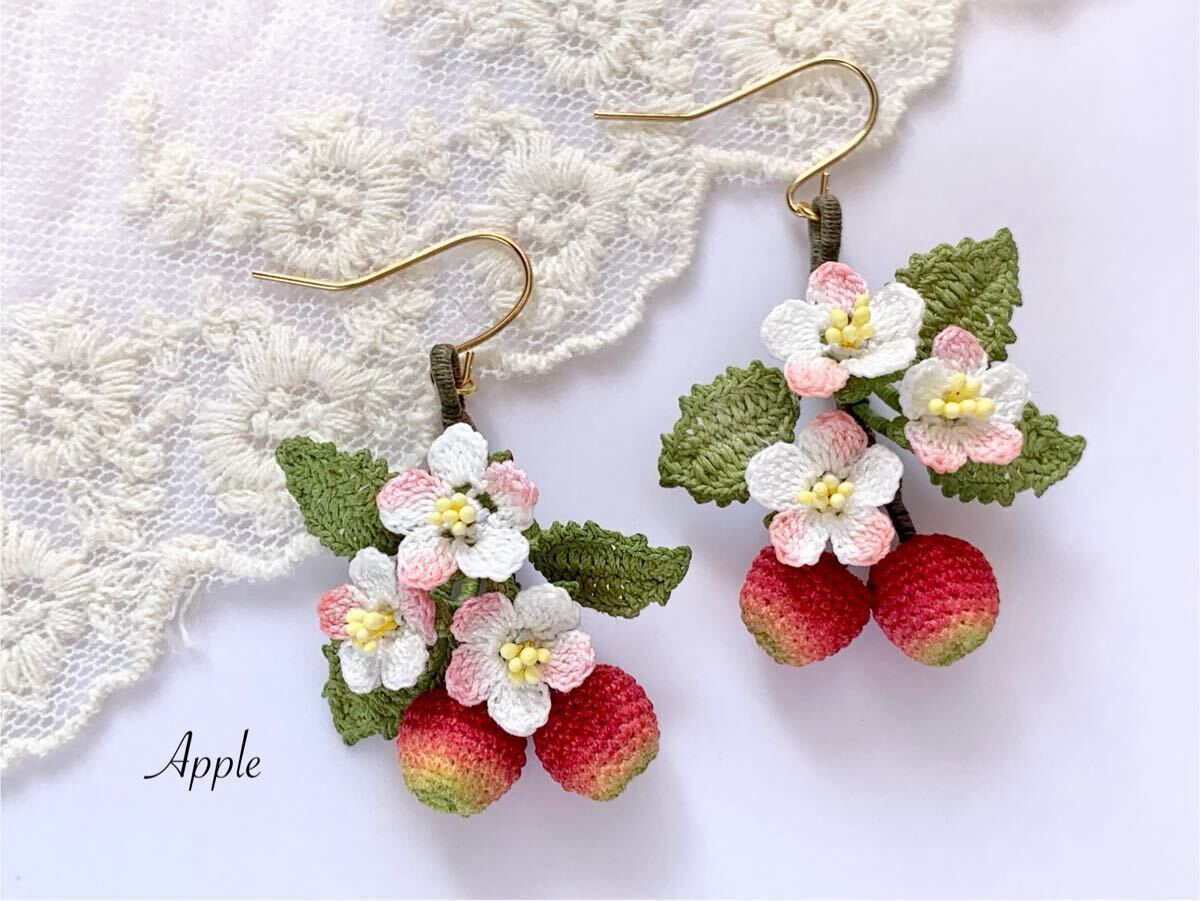 - りんご ピアス イヤリング 実 花 レース編み 80番 ハンドメイド かぎ針編み 林檎