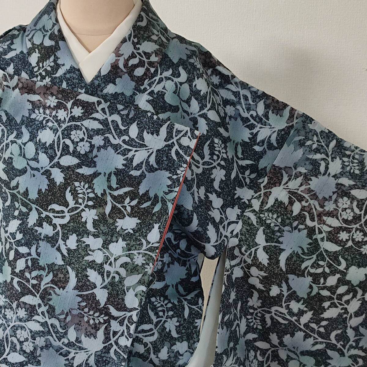 > 即決■着物の越田■裄66身丈164.5 紬 ボタニカル しつけ糸有り ブルーグリーン系 青緑系■む02E02