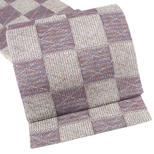 - 袋帯 中古 リサイクル 正絹 カジュアル 仕立て上がり 全通 組織 組帯 市松模様 葡萄鼠色 白鼠色 多色 きもの北條 A1266-10
