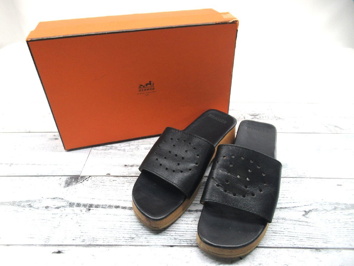 - ★【B送900円】2348 HERMES エルメス レザーサンダル ミュール オープントゥ ブラック ウッドソール カットワーク 箱付き 35