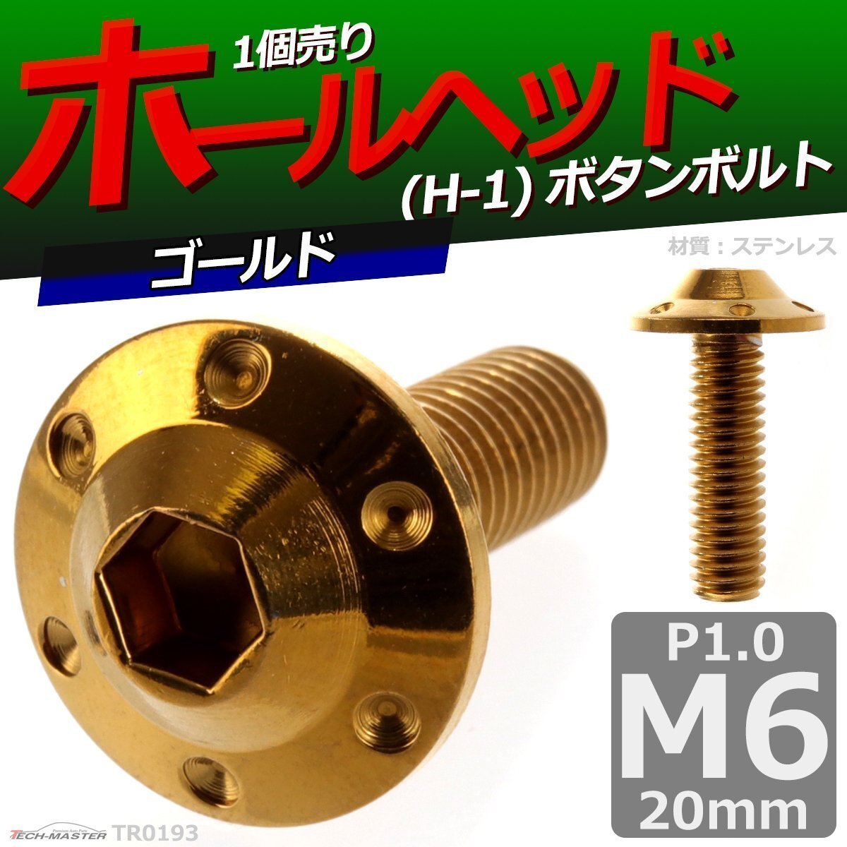 - M6×20mm P1.0 ボタンボルト ホールヘッド H-1 ステンレス 車/バイク/自転車 ドレスアップ パーツ ゴールド 1個 TR0193