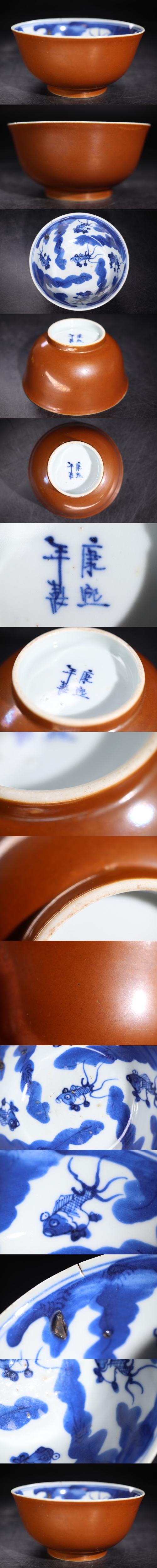 > 康熙年製 底款 銹釉 色釉 染付 魚文 茶碗 / 清 康熙 中国美術 茶器 煎茶道具 煎茶飾 .G2448
