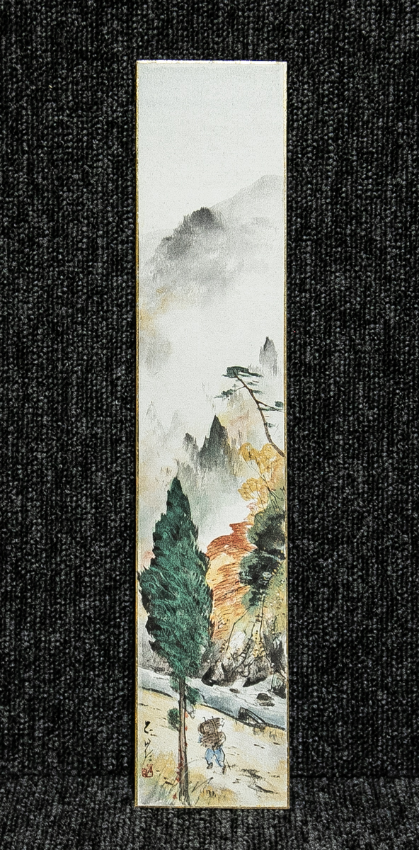 - 短冊-2607 岡田石嶺 秋渓山水 幅広短冊 中京画壇 川北霞峰に師事【真作】