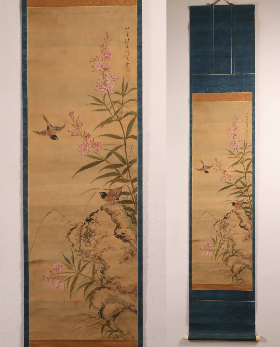- 【模写】作者不明 花鳥図 絹本 掛け軸 彩色 日本画 古い MA832