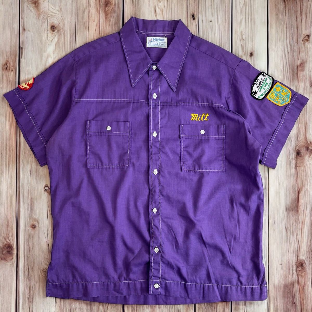 > 【希少】 70s Hilton ヒルトン パープル系 ヴィンテージ ボーリングシャツ 半袖シャツ 羽織り ビンテージ アメカジ サイズ16 L 古着