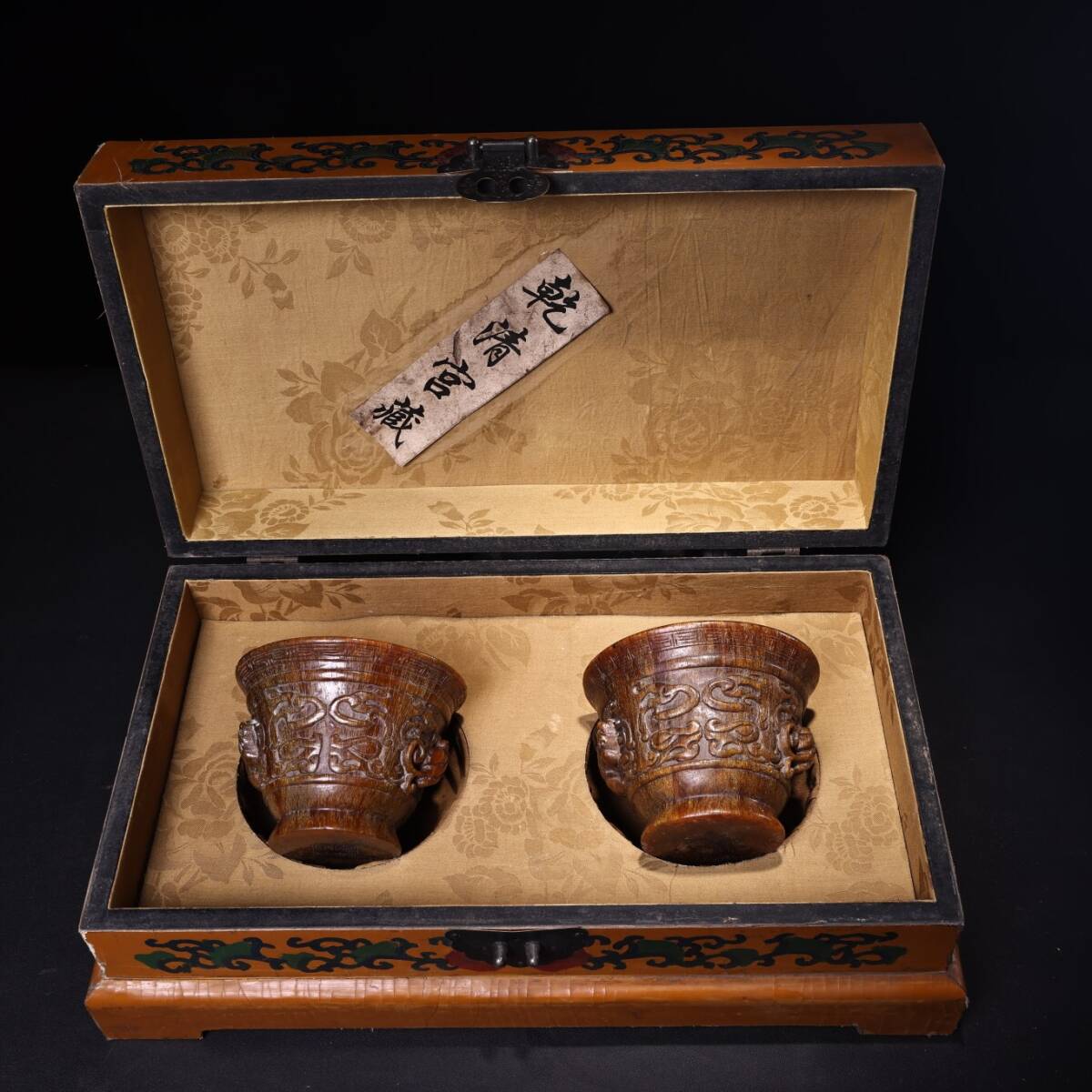 - 『館蔵珍品 角材細密彫 古龍杯一對 箱付 彩繪 神獣紋 置物 賞物』稀少珍蔵品 古賞物 貴重物品 収蔵品 中国古美術 時代物 古董品
