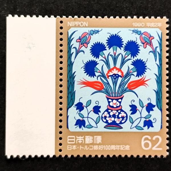> [25090615]【日本・トルコ修好100周年記念】単片 耳紙付「チューリップとカーネーションの文様」62円 1990年発行 美品