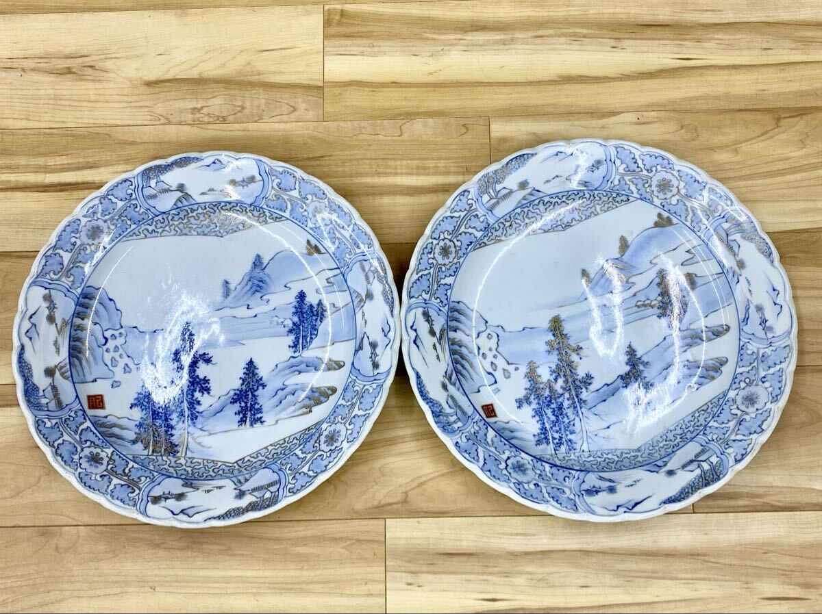 - 〈N7991〉 大皿 2枚セット 有田焼 染付 金彩 和食器 直径約40.5cm アンティーク器 レトロ インテリア