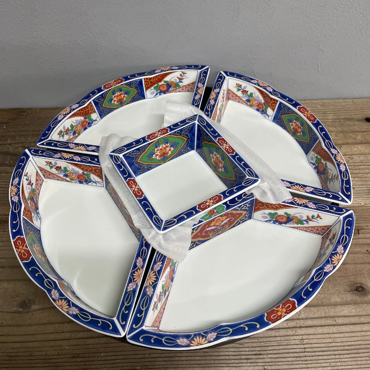 - 未使用品 保管品 回転式 オードブル パーティー皿 陶器 皿5枚 中華皿 shaddy
