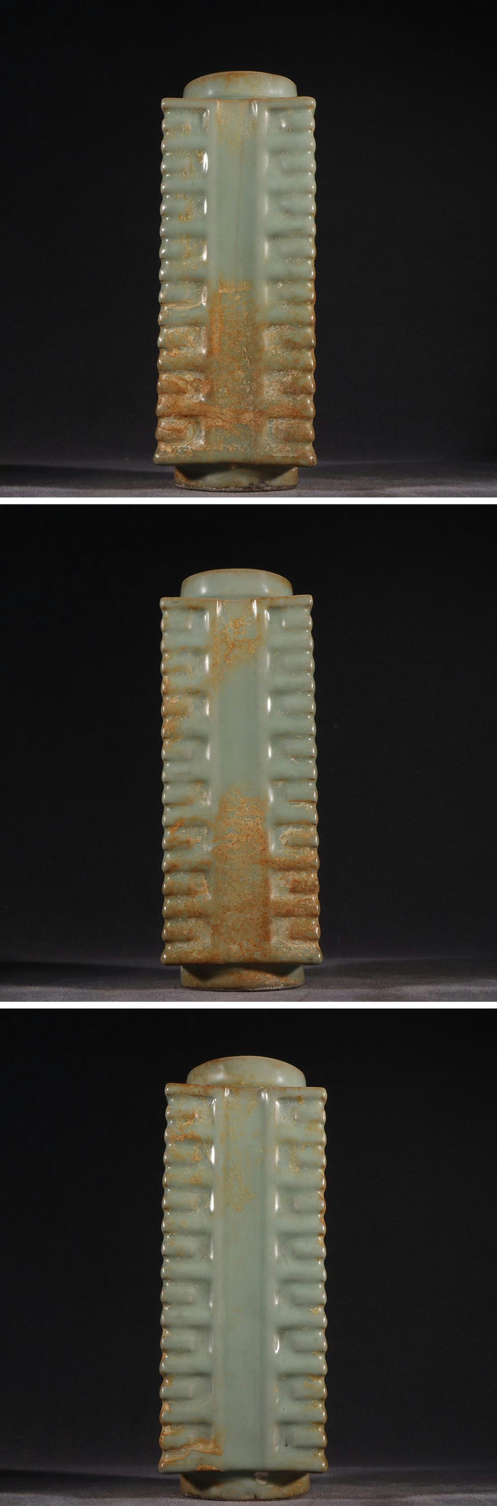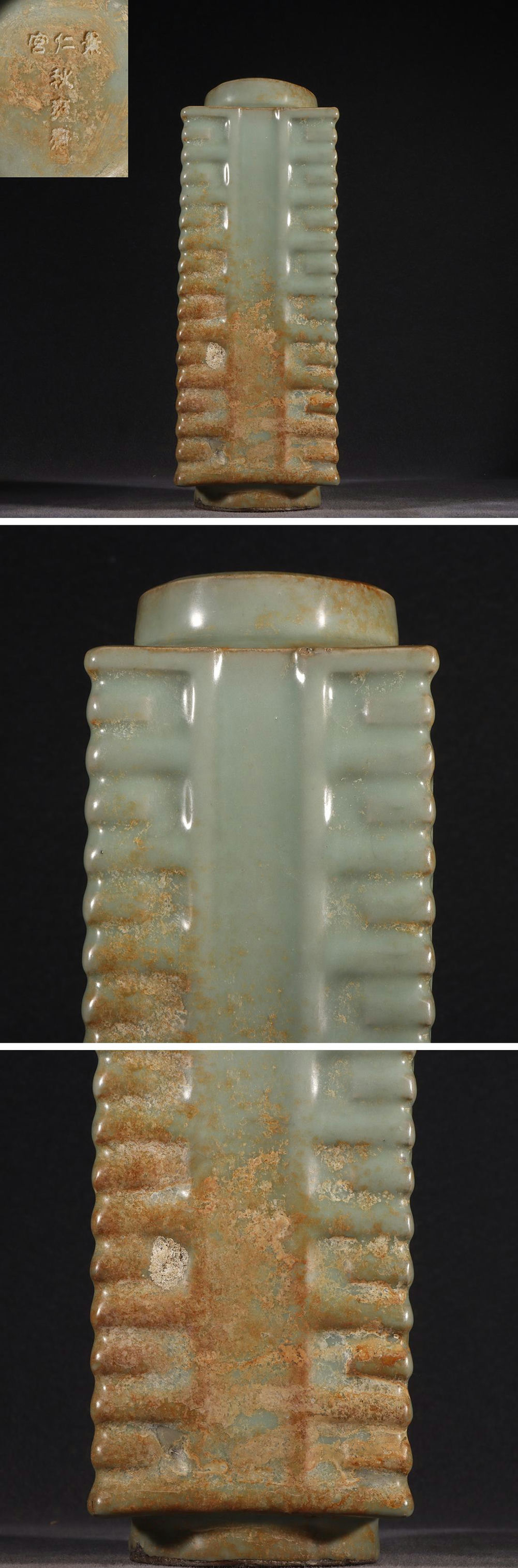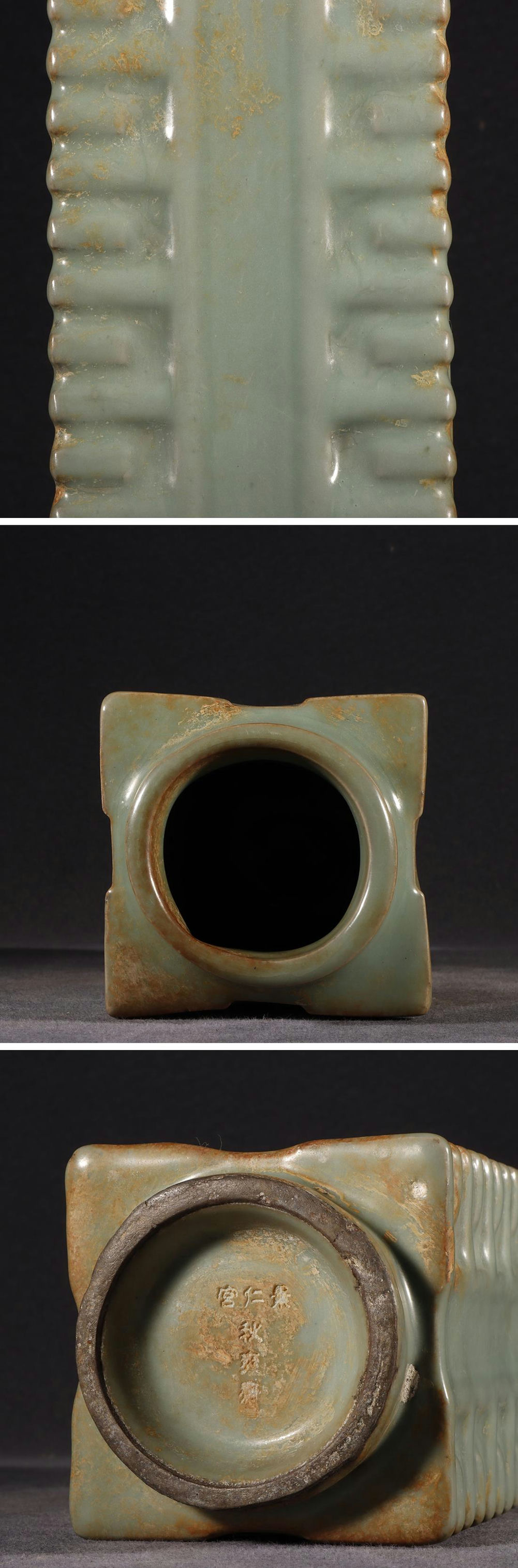 - ◆羽彰・古美術◆Y0490宋時代 官窯粉青釉 景仁宮款 琮式瓶・時代物・古陶磁・古賞物・旧家買出品