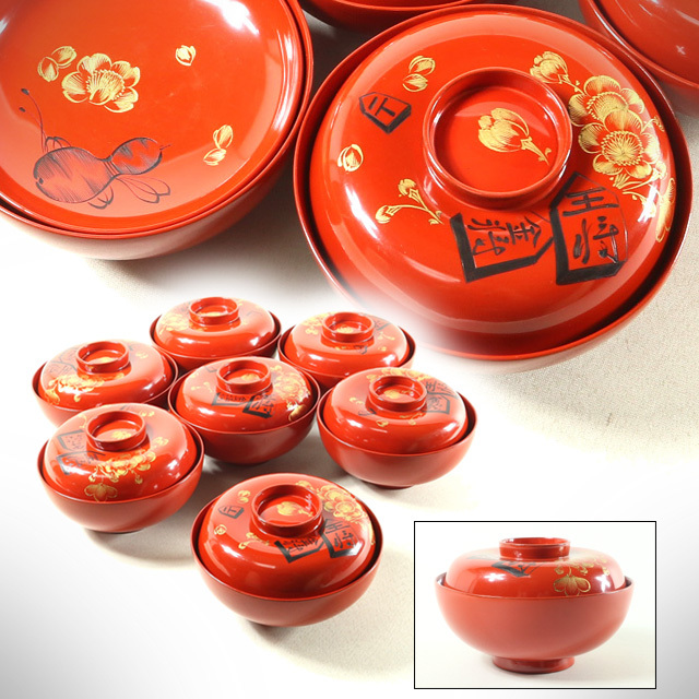 ●c053●美【沈金沈黒吸物椀7客 王将 将棋駒 桜 瓢箪 朱 布着】検お茶会煎茶道具茶懐石輪島塗蒔絵●西瓜●