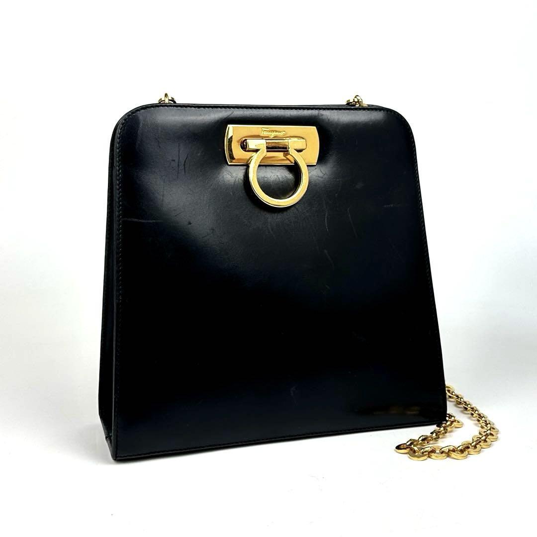 - 人気●Salvatore Ferragamo フェラガモ ショルダーバッグ ガンチーニ チェーン 斜め掛け 裏地総柄 レザー 黒 ブラック フォーマル 男女兼用