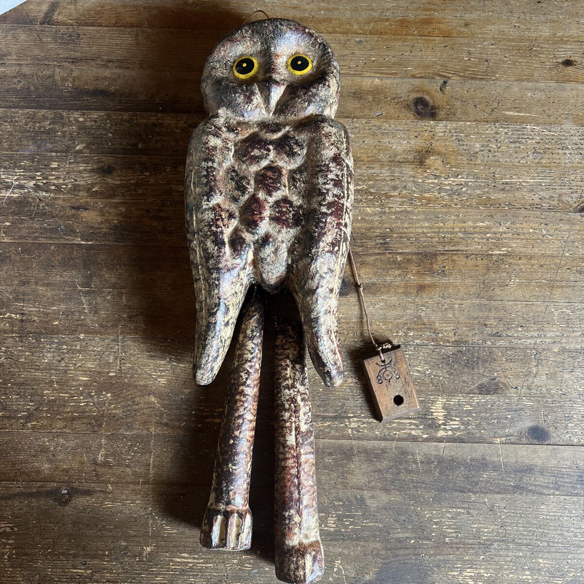 - T9-7-1 民藝 野鳥ゴロ助 梟 張り子フクロウの呼び鈴 ドアベル 古道具 郷土玩具 訳あり
