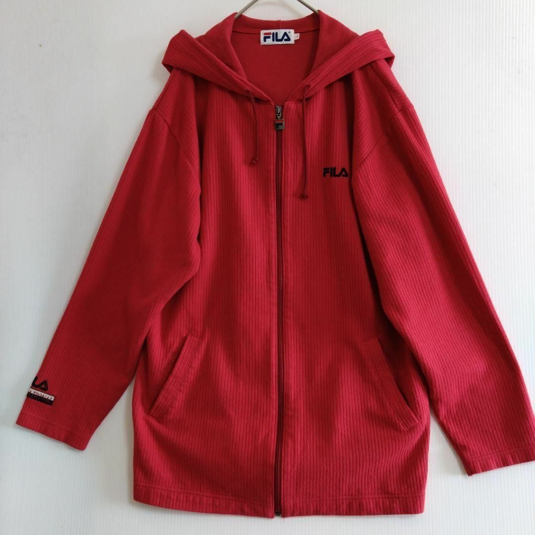 - 842 FILA スウェットパーカ L 赤 縦柄 フルジップ レディス
