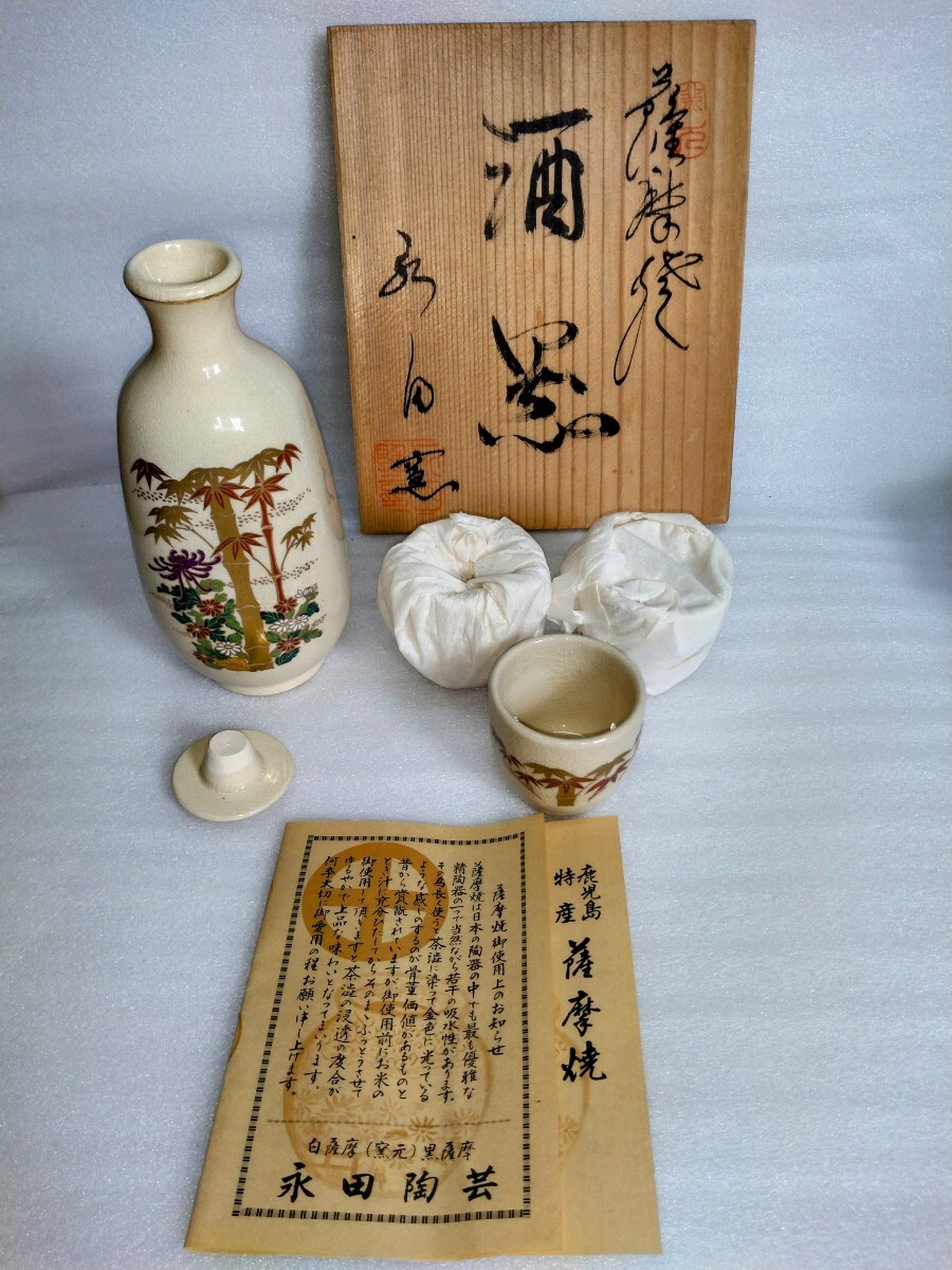 - K370【未使用/保管品】 薩摩焼 白薩摩 永田窯 酒器 〈菊竹〉 徳利 お猪口 共箱