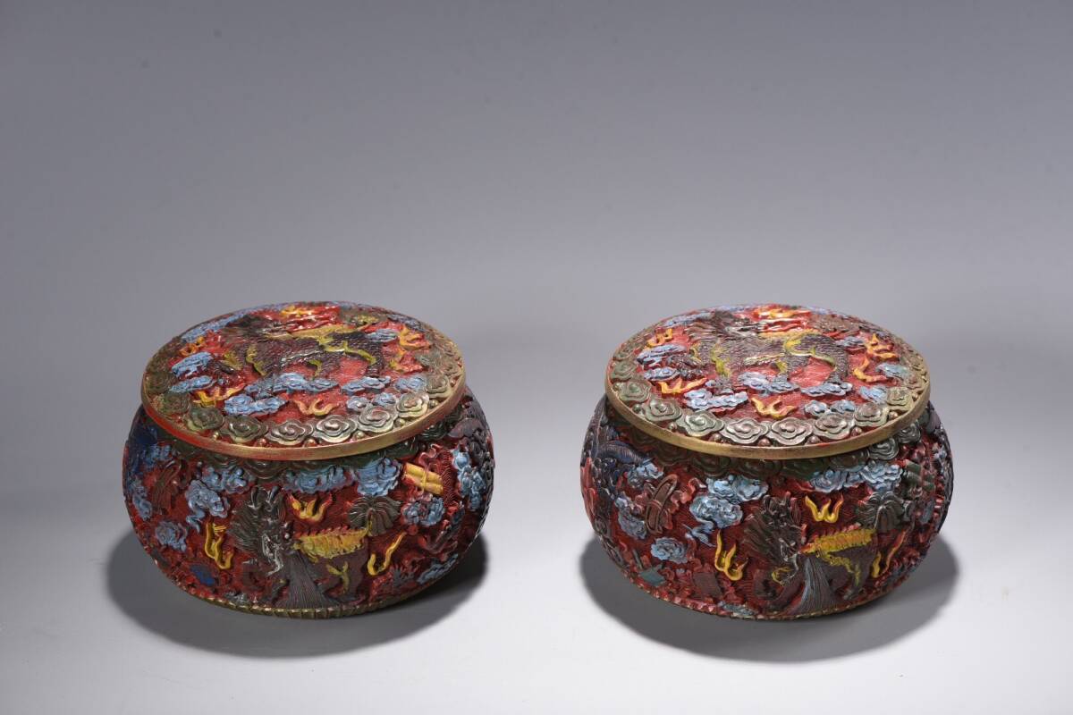 - 蔵友旧蔵出 剔紅漆器彫 彩繪 麒麟獻瑞紋 圍棋罐一對 供養品 置物擺件 古賞物 中国古玩 中国古美術品