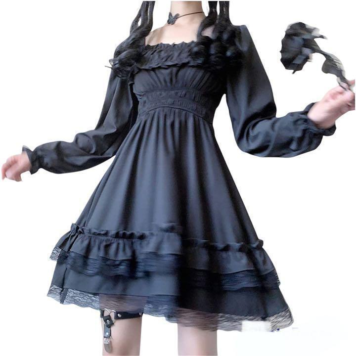 - 人気急上昇 M ゴスロリ ワンピース コスプレ ひざ丈 フリル レース ゴシック ロリータ 女の子 萌え おしゃれ 外出 トレンドカラー