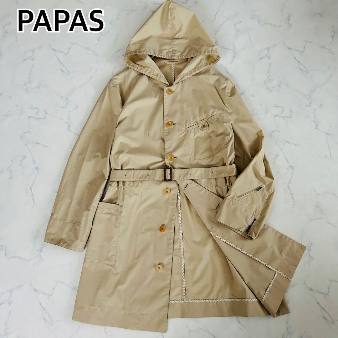- 【希少デザイン】PAPAS パパス モーターサイクルコート フーディーコート ステンカラーコート ロング丈 ベルト ベージュ 50 L