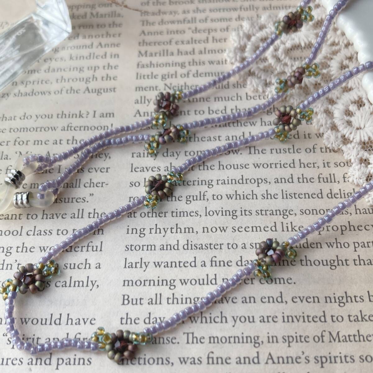 - めがねチェーン ビーズ 薄紫 アンティークビーズ ガラス フラワー お花☆vintage jewelry accessories F0056