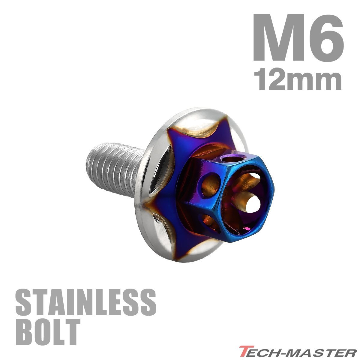 > M6×12mm P1.0 ワイドフランジボルト スターフラワーヘッド ステンレス シルバー×焼きチタンカラー 車 バイク カスタム 1個 TB0996