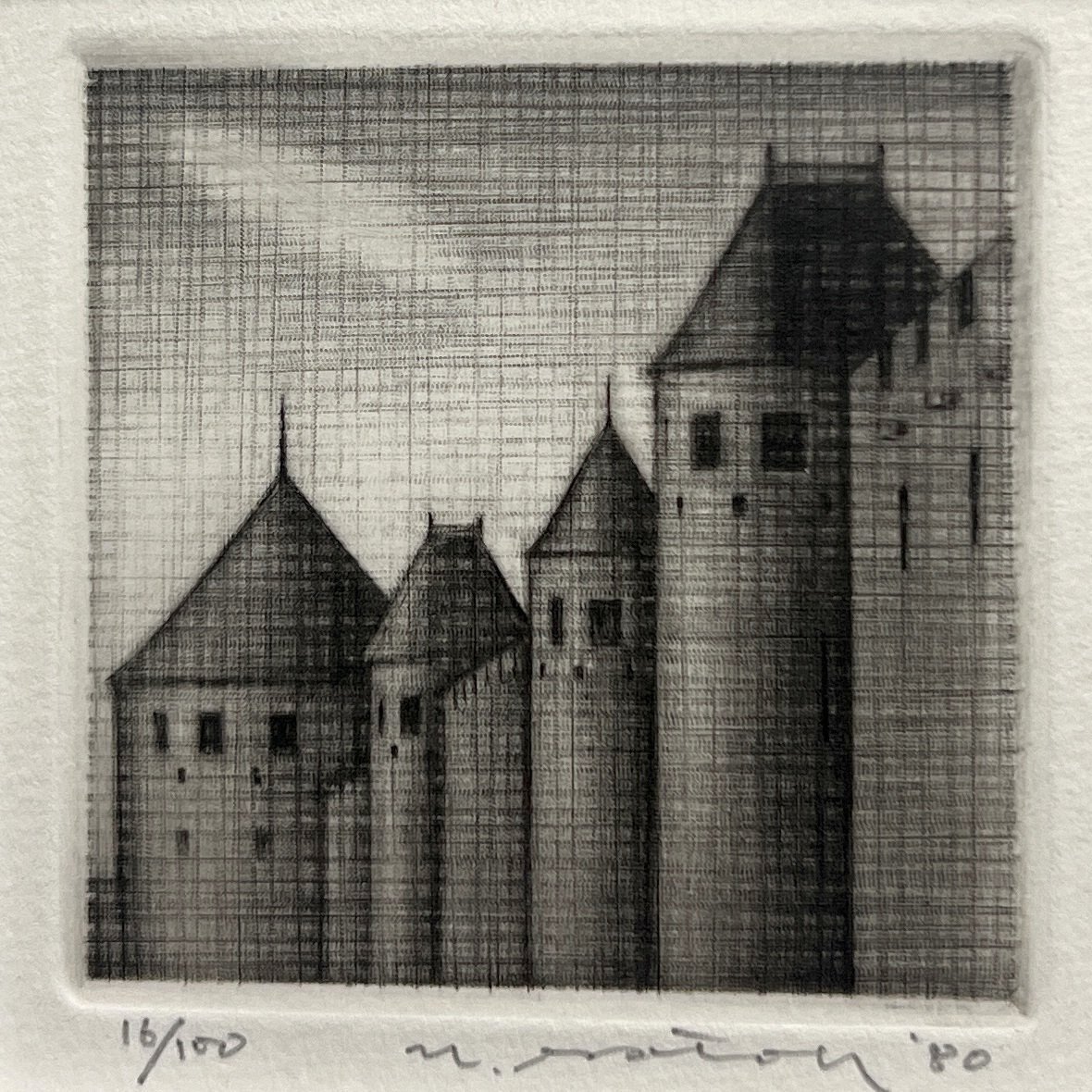 - 小ぶりな飾りやすいアート 作者不明 古城 銅版画 作品サイズ62×62mm エディション入り エッチング 直筆サイン入り お城 アート 絵画 A