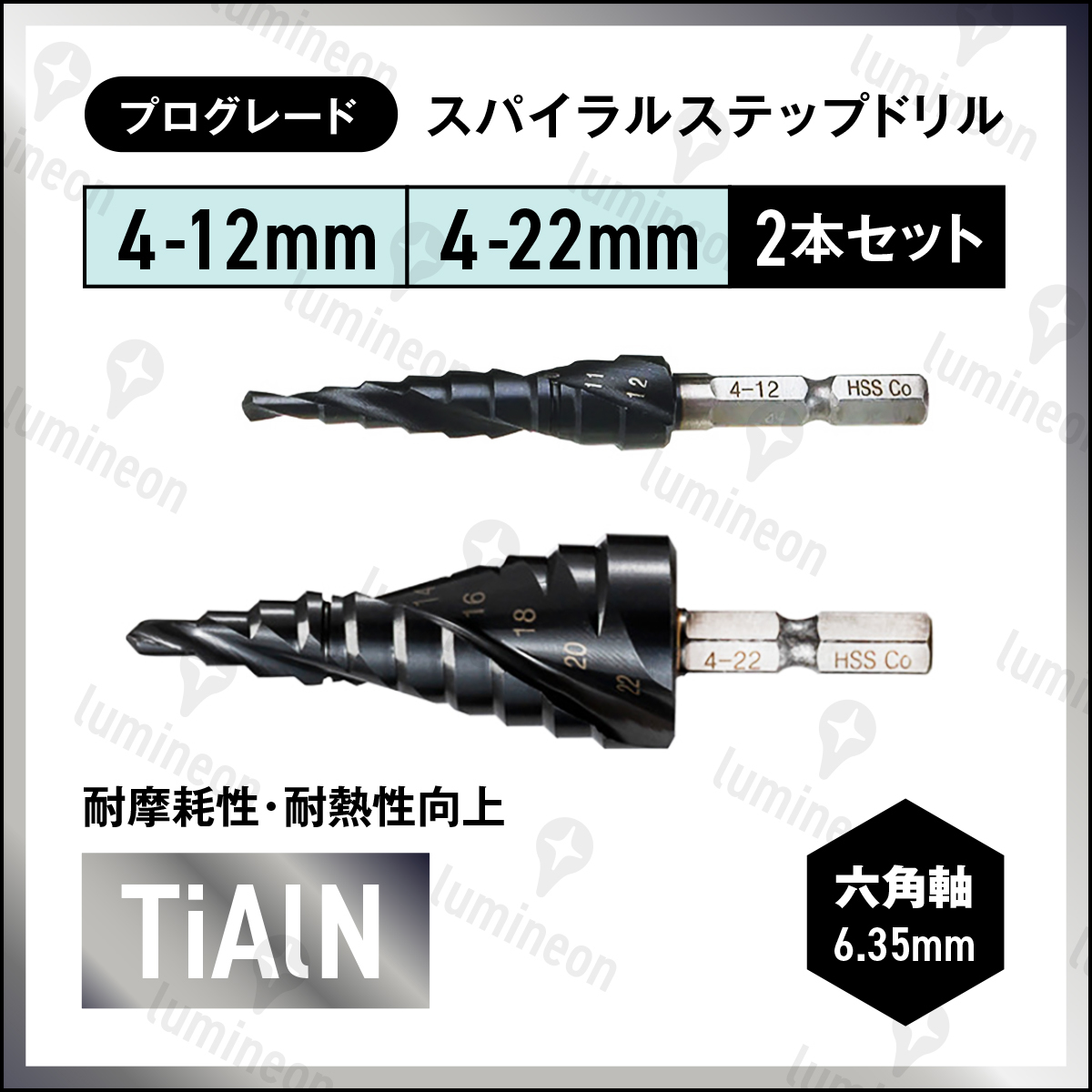 - ステップ ドリル スパイラル ステンレス用 チタン 4-12mm 4-22mm セット ビット ドリル 刃 鉄工 用 金属 六角軸 穴あけ タケノコ g031d 1